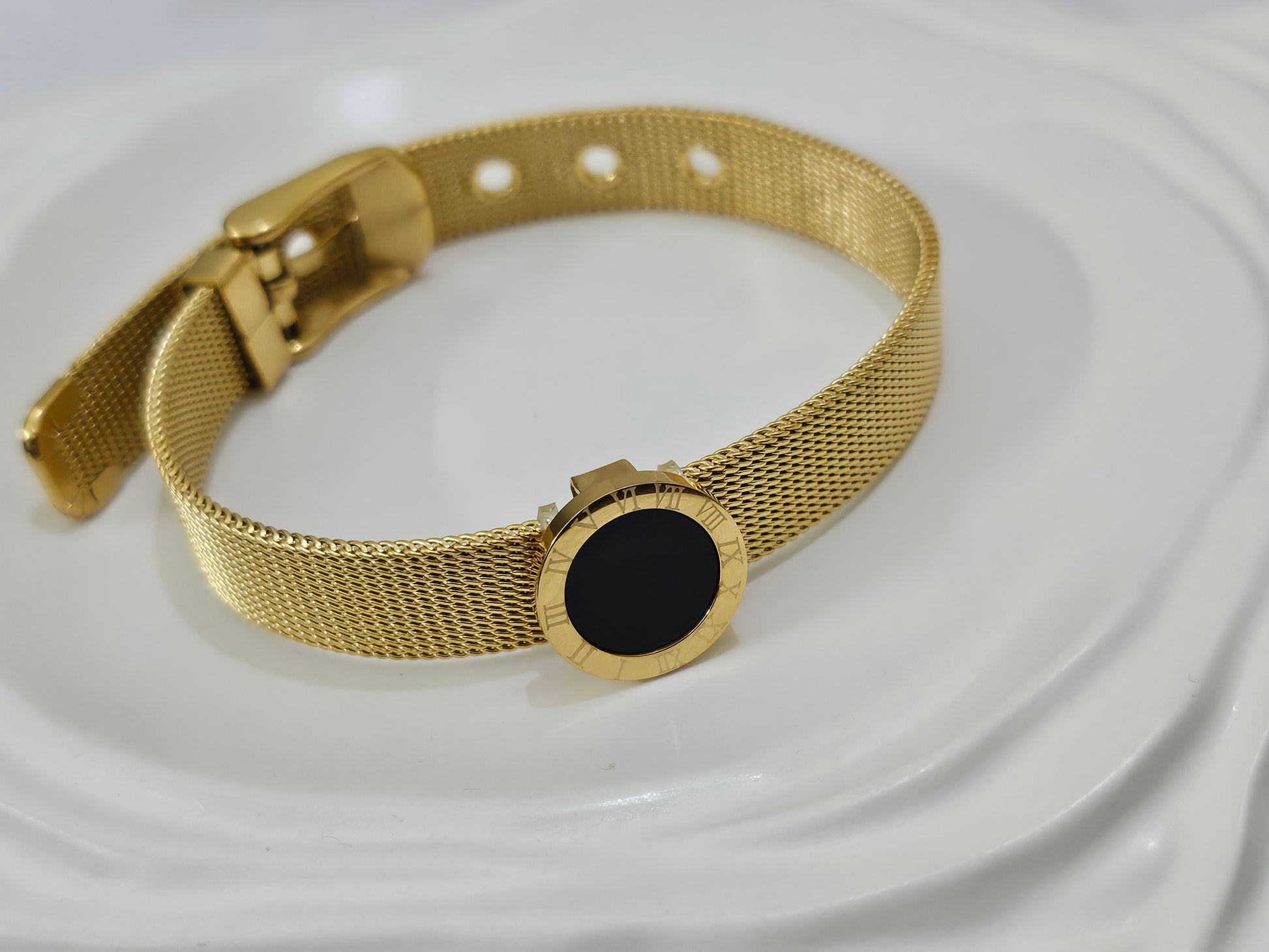 A black and gold Roman watch bracelet is a stylish and elegant timepiece that seamlessly blends classic sophistication with modern luxury. The black dial or strap, combined with gold-tone accents, creates a striking contrast, making it a perfect accessory for both formal and casual occasions. The addition of Roman numeral hour markers adds a timeless charm, reminiscent of vintage European craftsmanship.